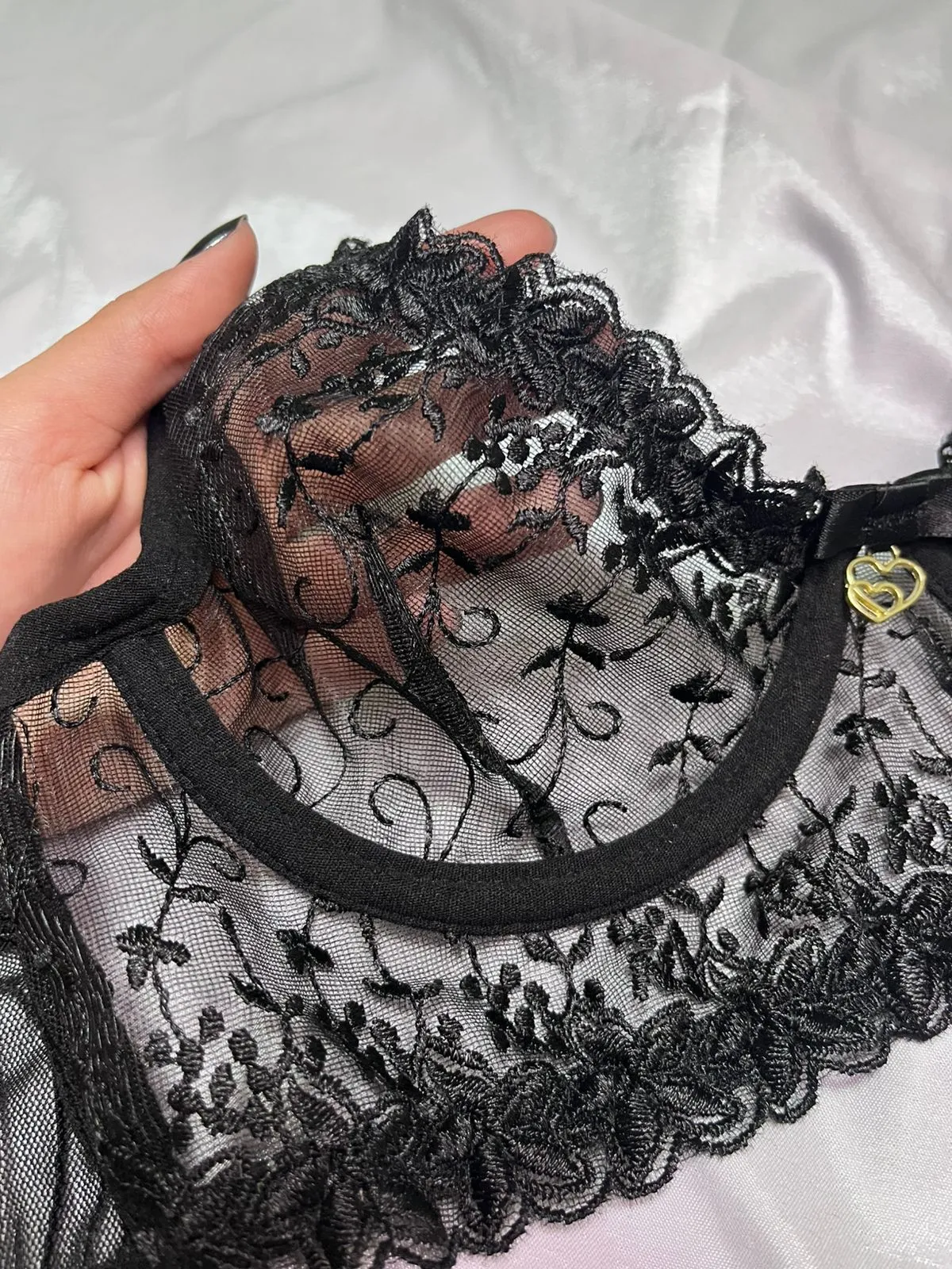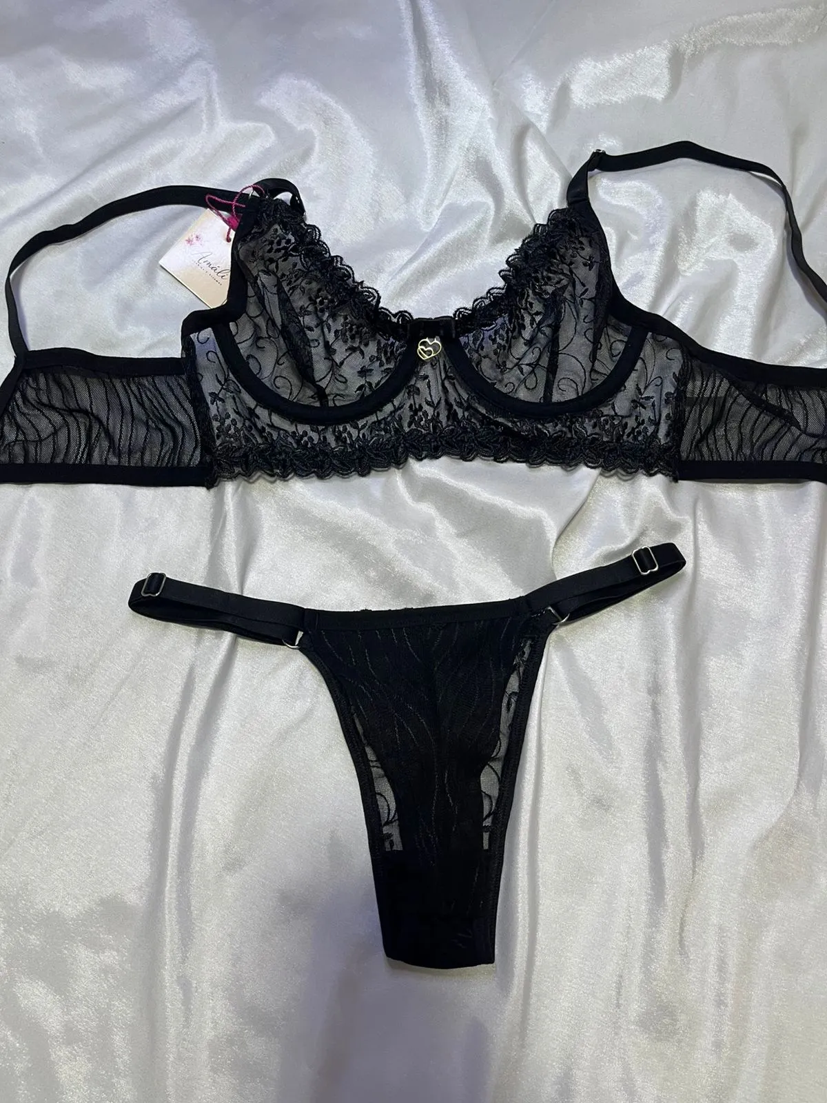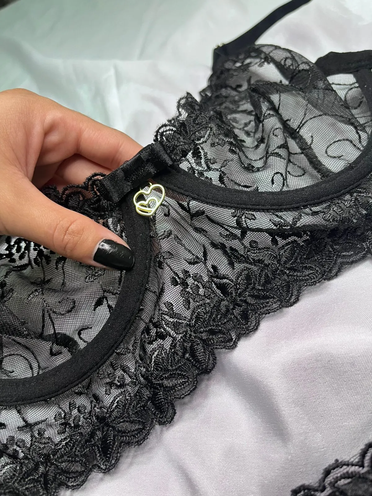 O Conjunto Emily foi desenvolvido para mulheres que desejam unir sofisticação, elegância e sensualidade em uma única peça. Confeccionado em tule transparente preto com bordados delicados, ele valoriza o corpo com leveza, conforto e um toque irresistivelmente sedutor.