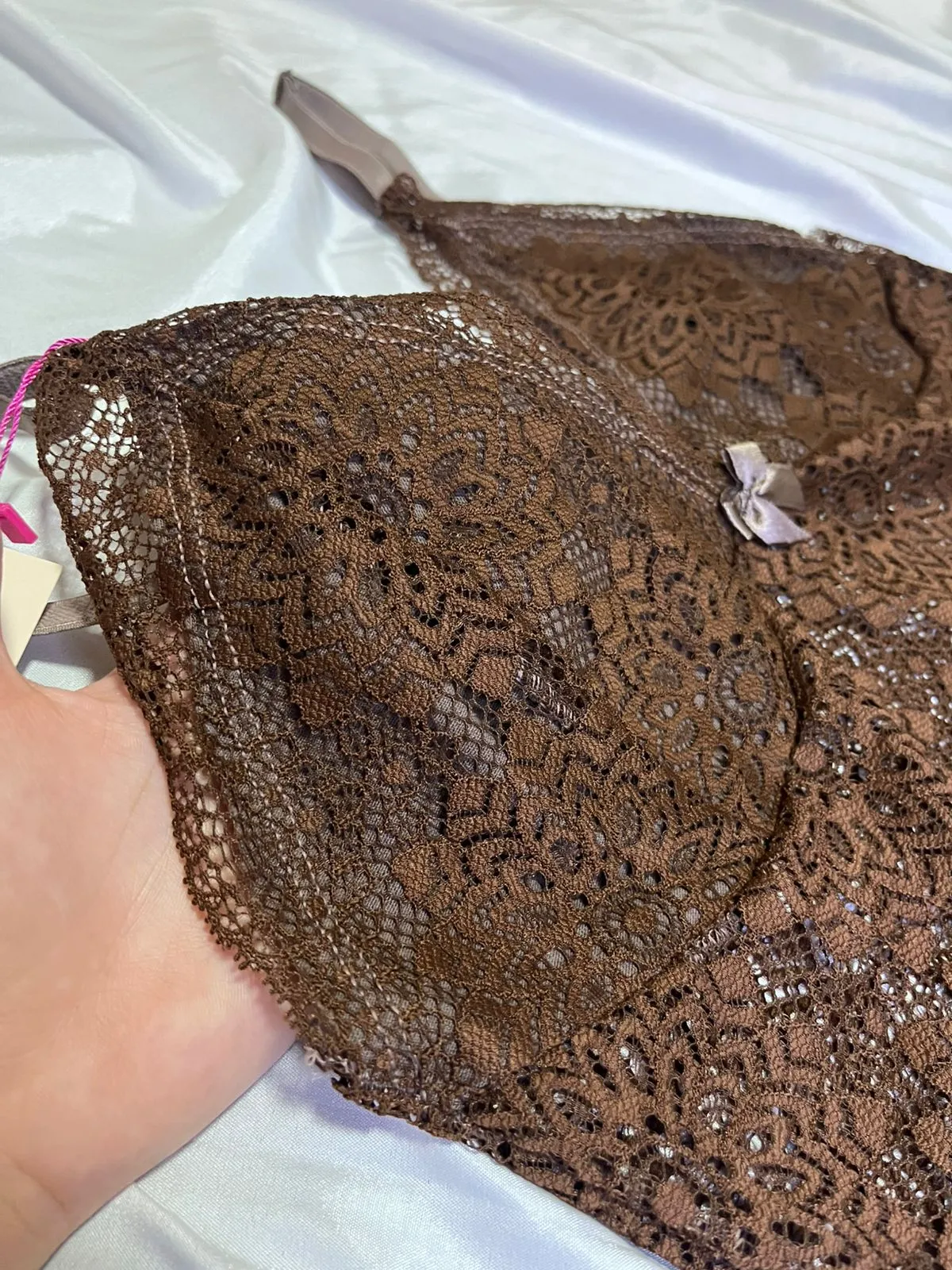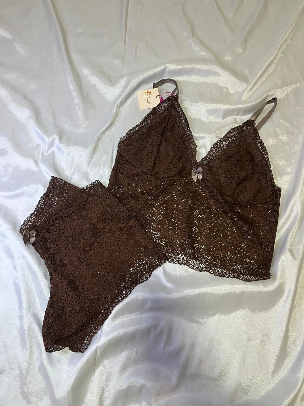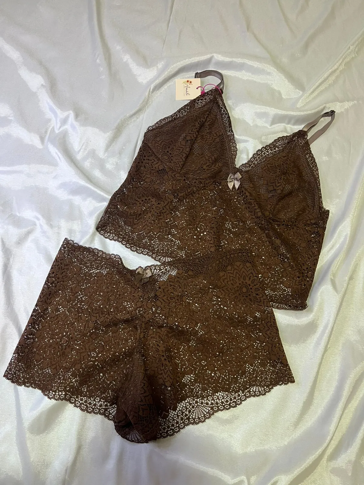 Conjunto Lingerie Mel Sem Aro Sem Bojo Marrom em Renda
