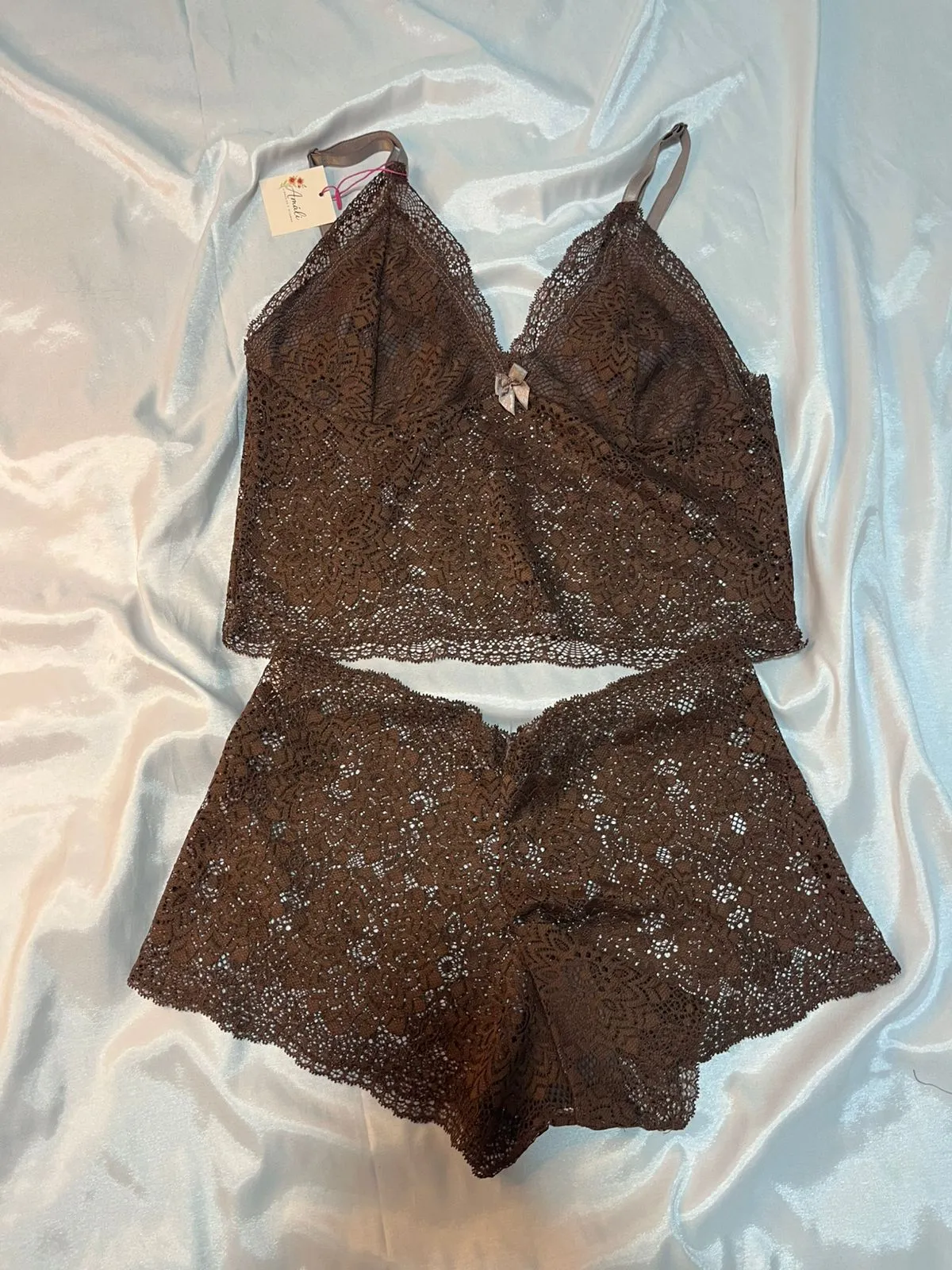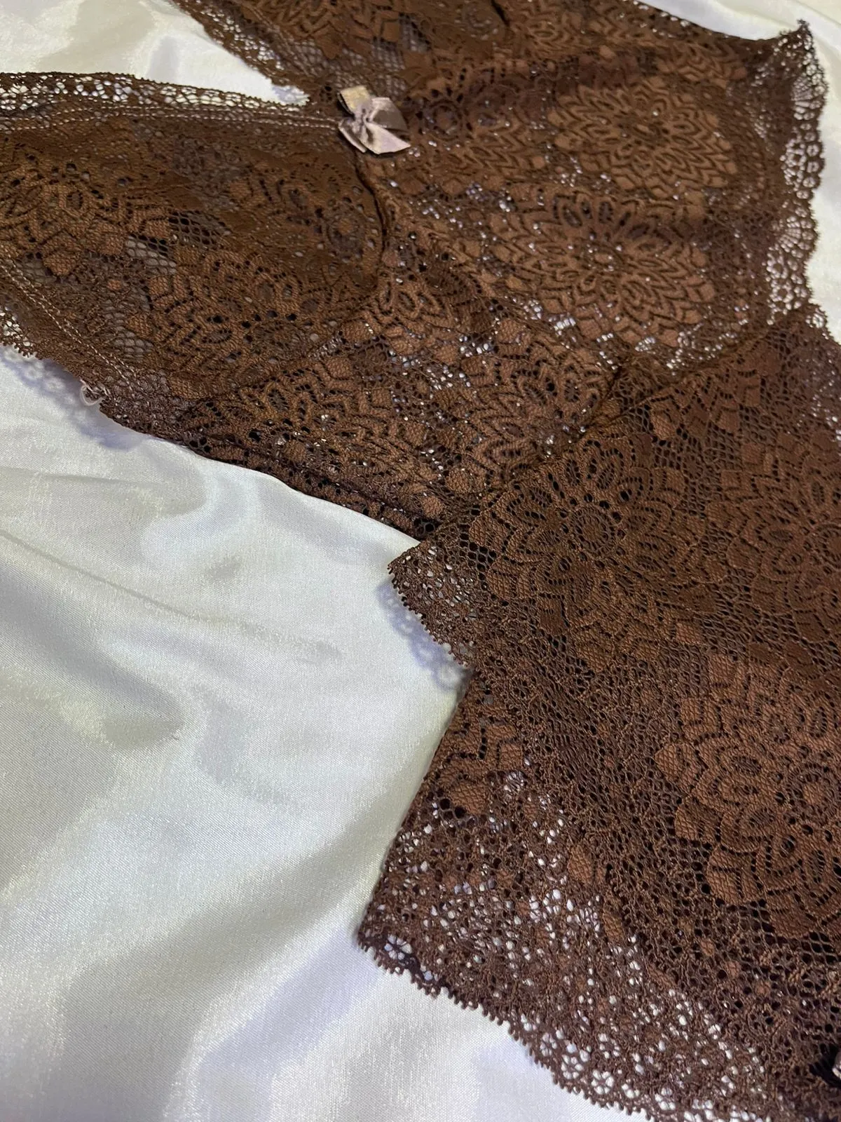 O Conjunto Mel foi criado para mulheres que buscam conforto absoluto sem abrir mão da delicadeza e da sensualidade. Confeccionado em renda marrom de desenho floral, ele envolve o corpo com leveza, toque macio e um caimento naturalmente elegante.
